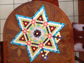 Sew those are my La Passacaglia rosettes - there needs to be just tons of them. These are much smaller pieces than the New Hexagon Millefiore pieces. It's all very times consuming...